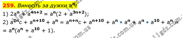 Винесіть за дужки аn: 1) 2аn + а4n+2 = аn(2 + а3n+2); 2) а2nс + аn+10 + аn = аn+nс + аn+10 + an • аn + аn • а10 + аn = = аn(аn + а10 + 1).
