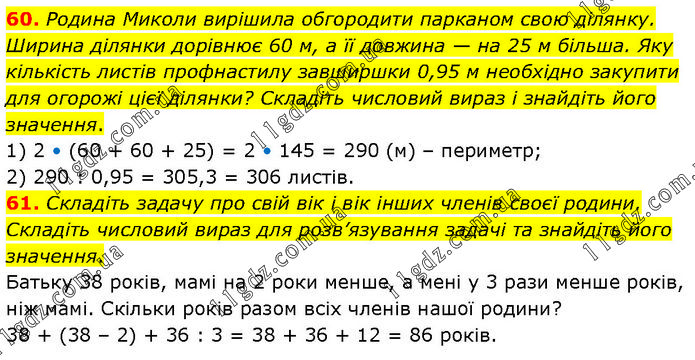 60. Родина Миколи вирішила обгородити парканом свою ділянку. Ширина ділянки дорівнює 60 м, а її довжина — на 25 м більша. Яку кількість листів профнастилу завширшки 0,95 м необхідно закупити для огорожі цієї ділянки? Складіть числовий вираз і знайдіть його значення. 1) 2 • (60 + 60 + 25) = 2 • 145 = 290 (м) – периметр; 2) 290 : 0,95 = 305,3 = 306 листів. 61. Складіть задачу про свій вік і вік інших членів своєї родини. Складіть числовий вираз для розв’язування задачі та знайдіть його значення. Батьку 38 років, мамі на 2 роки менше, а мені у 3 рази менше років, ніж мамі. Скільки років разом всіх членів нашої родини? 38 + (38 – 2) + 36 : 3 = 38 + 36 + 12 = 86 років.