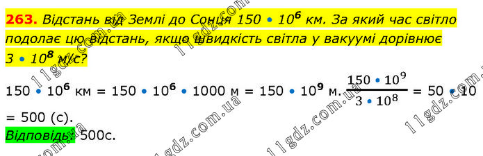 Відстань від Землі до Сонця 150 • 106 км. За який час світло подолає цю відстань, якщо швидкість світла у вакуумі дорівнює 3 • 108 м/с? 150 • 106 км = 150 • 106 • 1000 м = 150 • 109 м. (150 • 10^9)/(3 • 10^8 ) = 50 • 10 = 500 (с). Відповідь: 500с.