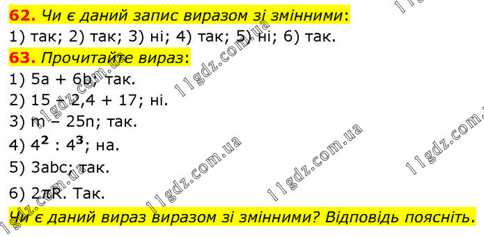 62. Чи є даний запис виразом зі змінними: 1) так; 2) так; 3) ні; 4) так; 5) ні; 6) так. 63. Прочитайте вираз: 1) 5а + 6b; так. 2) 15 – 2,4 + 17; ні. 3) m – 25n; так. 4) 42 : 43; на. 5) 3аbс; так. 6) 2R. Так. Чи є даний вираз виразом зі змінними? Відповідь поясніть.