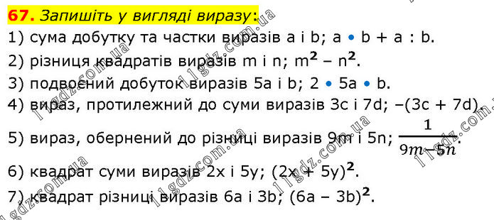 Запишіть у вигляді виразу: 1) сума добутку та частки виразів а і b; a • b + a : b. 2) різниця квадратів виразів m і n; m2 – n2. 3) подвоєний добуток виразів 5а і b; 2 • 5a • b. 4) вираз, протилежний до суми виразів Зс і 7d; –(3c + 7d). 5) вираз, обернений до різниці виразів 9m і 5n; 1/(9m-5n). 6) квадрат суми виразів 2х і 5у; (2x + 5y)2. 7) квадрат різниці виразів 6а і Зb; (6a – 3b)2.