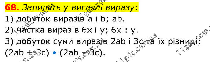 Запишіть у вигляді виразу: 1) добуток виразів а і b; ab. 2) частка виразів 6х і у; 6x : y. 3) добуток суми виразів 2аb і Зс та їх різниці; (2ab + 3c) • (2ab – 3c).