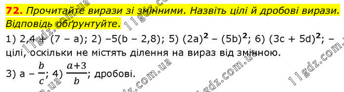 Прочитайте вирази зі змінними. Назвіть цілі й дробові вирази. Відповідь обґрунтуйте. 1) 2,4 + (7 – а); 2) –5(b – 2,8); 5) (2а)2 – (5b)2; 6) (3c + 5d)2; – цілі, оскільки не містять ділення на вираз від змінною. 3) а – b/c; 4) (a+3)/b; дробові.