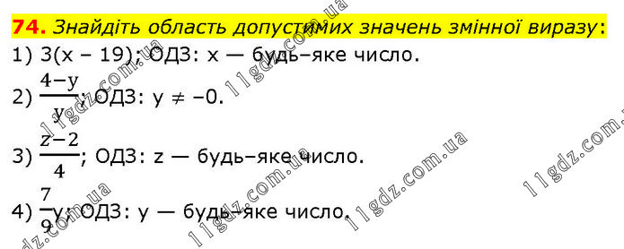 Знайдіть область допустимих значень змінної виразу: 1) 3(х – 19); ОДЗ: х — будь–яке число. 2) (4-у)/у; ОДЗ: у ≠ –0. 3) (z-2)/4; ОДЗ: z — будь–яке число. 4) 7/9y; ОДЗ: y — будь–яке число.