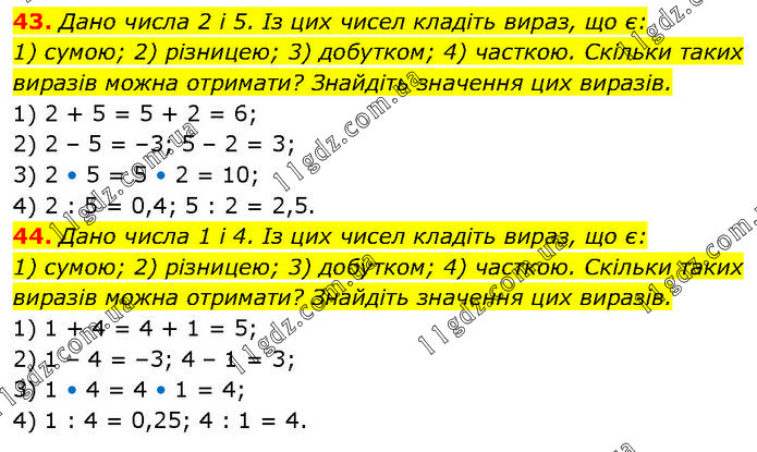 43. Дано числа 2 і 5. Із цих чисел кладіть вираз, що є: 1) сумою; 2) різницею; 3) добутком; 4) часткою. Скільки таких виразів можна отримати? Знайдіть значення цих виразів. 1) 2 + 5 = 5 + 2 = 6; 2) 2 – 5 = –3; 5 – 2 = 3; 3) 2 • 5 = 5 • 2 = 10; 4) 2 : 5 = 0,4; 5 : 2 = 2,5. 44. Дано числа 1 і 4. Із цих чисел кладіть вираз, що є: 1) сумою; 2) різницею; 3) добутком; 4) часткою. Скільки таких виразів можна отримати? Знайдіть значення цих виразів. 1) 1 + 4 = 4 + 1 = 5; 2) 1 – 4 = –3; 4 – 1 = 3; 3) 1 • 4 = 4 • 1 = 4; 4) 1 : 4 = 0,25; 4 : 1 = 4.