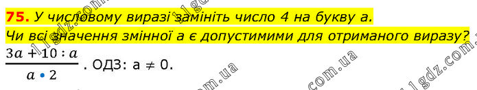 У числовому виразі замініть число 4 на букву а. Чи всі значення змінної а є допустимими для отриманого виразу? (3a + 10 ∶ a)/(a • 2) . ОДЗ: а ≠ 0.