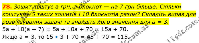Зошит коштує а грн, а блокнот — на 7 грн більше. Скільки коштують 5 таких зошитів і 10 блокнотів разом? Складіть вираз для розв'язування задачі та знайдіть його значення для а = 3. 5а + 10(а + 7) = 5a + 10а + 70 = 15а + 70. Якщо а = 3, то 15 • 3 + 70 = 45 + 70 = 115.