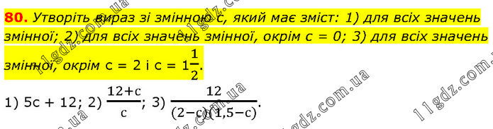 Утворіть вираз зі змінною с, який має зміст: 1) для всіх значень змінної; 2) для всіх значень змінної, окрім с = 0; 3) для всіх значень змінної, окрім с = 2 і с = 11/2. 1) 5с + 12; 2) (12+с)/с; 3) 12/((2-с)(1,5-с)).