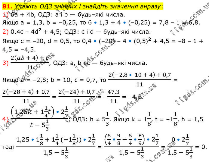 Укажіть ОДЗ змінних і знайдіть значення виразу: 1) 6а + 4b, ОДЗ: а і b — будь–які числа. Якщо а = 1,3, b = –0,25, то 6 • 1,3 + 4 • (–0,25) = 7,8 – 1 = 6,8. 2) 0,4с – 4d2 + 4,5; ОДЗ: с і d — будь–які числа. Якщо с = –20, d = 0,5, то 0,4 • (–20) – 4 • (0,5)2 + 4,5 = –8 – 1 + 4,5 = –4,5. 3) (2(ab + 4) + c)/11, ОДЗ: a, b і c — будь–які числа. Якщо a = –2,8; b = 10, c = 0,7, то (2(-2,8 • 10 + 4) + 0,7)/11 = (2(-28 + 4) + 0,7)/11 = (2(-24) + 0,7)/11 = –47,3/11 = –4,3. 4) ((1,25k + 1 1/4 t) • 2 1/7)/(t - 5 1/3); ОДЗ: h ≠ 51/3. Якщо k = 11/8, t = –11/8, h = 1,5 тоді (1,25 • 1 1/8 + 1 1/4 (-1 1/8)) • 2 1/7)/(1,5 - 5 1/3) = ((5/4 • 9/8 - 5/4 • 8/9) • 2 1/7)/(1,5 - 5 1/3) = (0 • 2 1/7)/(1,5 - 5 1/3) = 0.