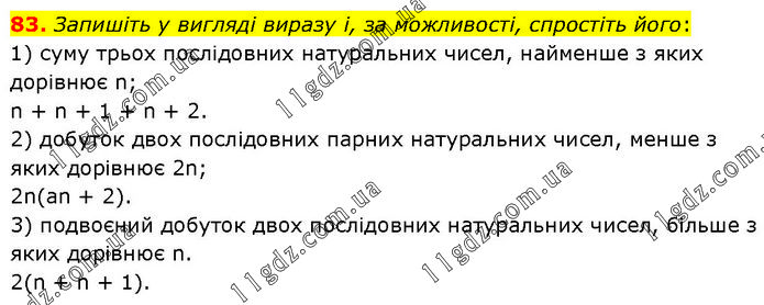 Запишіть у вигляді виразу і, за можливості, спростіть його: 1) суму трьох послідовних натуральних чисел, найменше з яких дорівнює n; n + n + 1 + n + 2. 2) добуток двох послідовних парних натуральних чисел, менше з яких дорівнює 2n; 2n(an + 2). 3) подвоєний добуток двох послідовних натуральних чисел, більше з яких дорівнює n. 2(n + n + 1).