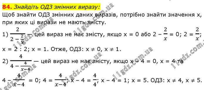 Знайдіть ОДЗ змінних виразу: Щоб знайти ОДЗ змінних даних виразів, потрібно знайти значення х, при яких ці вирази не мають змісту. 1) 2/(2 - 2/x ) — цей вираз не має змісту, якщо х = 0 або 2 – 2/x = 0; 2 = 2/x; х = 2 : 2; х = 1. Отже, ОДЗ: x ≠ 0, х ≠ 1. 2) 4/(4 - 4/(x-4) ) — цей вираз не має змісту, якщо х – 4 = 0, х = 4 та 4 – 4/(x-4) = 0; 4 = 4/(x-4); х – 4 = 4/4; x – 4 = 1; x = 5. ОДЗ: x ≠ 4, x ≠ 5.
