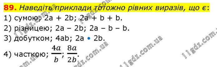 Наведіть приклади тотожно рівних виразів, що є: 1) сумою; 2а + 2b; 2а + b + b. 2) різницею; 2а – 2b; 2а – b – b. 3) добутком; 4ab; 2a • 2b. 4) часткою; 4a/b; 8a/2b.