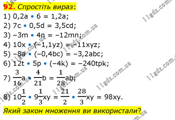 Спростіть вираз: 1) 0,2а • 6 = 1,2a; 2) 7с • 0,5d = 3,5cd; 3) –3m • 4n = –12mn; 4) 10x • (–1,1yz) = –11xyz; 5) –8а • (–0,4bс) = –3,2abc; 6) 12t • 5р • (–4k) = –240tpk; 7) 3/16а • 4/21b = 1/28ab; 8) 101/2 • 91/3xy = 21/2 • 28/3xy = 98xy. Який закон множення ви використали?
