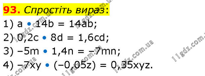 Спростіть вираз: 1) а • 14b = 14ab; 2) 0,2с • 8d = 1,6cd; 3) –5m • 1,4n = –7mn; 4) –7ху • (–0,05z) = 0,35xyz.