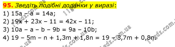 Зведіть подібні доданки у виразі: 1) 15а – а = 14a; 2) 19x + 23x – 11 = 42x – 11; 3) 10а – а – b – 9b = 9a – 10b; 4) 19 – 5m – n + 1,3m + 1,8n = 19 – 3,7m + 0,8n.