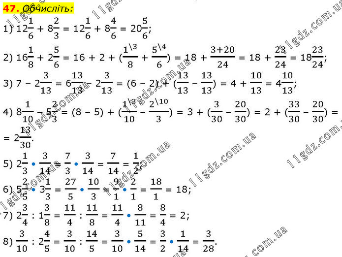 Обчисліть: 1) 121/6 + 82/3 = 121/6 + 84/6 = 205/6; 2) 161/8 + 25/6 = 16 + 2 + (1^(\3)/8 + 5^(\4)/6) = 18 + (3+20)/24 = 18 + 23/24 = 1823/24; 3) 7 – 23/13 = 613/13 – 23/13 = (6 – 2) + (13/13 – 13/13) = 4 + 10/13 = 410/13; 4) 81/10 – 52/3 = (8 – 5) + (1^(\3)/10 – 2^(\10)/3) = 3 + (3/30 – 20/30) = 2 + (33/30 – 20/30) = = 213/30. 5) 21/3 • 3/14 = 7/3 • 3/14 = 7/14 = 1/2; 6) 52/5 • 31/3 = 27/5 • 10/3 = 9/1 • 2/1 = 18/1 = 18; 7) 23/4 : 13/8 = 11/4 : 11/8 = 11/4 • 8/11 = 8/4 = 2; 8) 3/10 : 24/5 = 3/10 : 14/5 = 3/10 • 5/14 = 3/2 • 1/14 = 3/28.