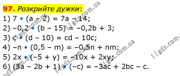 Розкрийте дужки: 1) 7 • (а – 2) = 7a – 14; 2) –0,2 • (b – 15) = –0,2b + 3; 3) с • (d – 10) = cd – 10c; 4) –n • (0,5 – m) = –0,5n + nm; 5) 2х • (–5 + у) = –10x + 2xy; 6) (За – 2b + 1) • (–с) = –3ac + 2bc – c.
