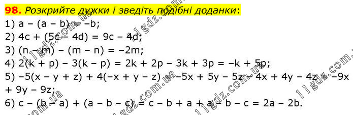 Розкрийте дужки і зведіть подібні доданки: 1) а – (а – b) = –b; 2) 4с + (5с – 4d) = 9c – 4d; 3) (n – m) – (m – n) = –2m; 4) 2(k + р) – 3(k – р) = 2k + 2p – 3k + 3p = –k + 5p; 5) –5(х – у + z) + 4(–х + у – z) = –5x + 5y – 5z – 4x + 4y – 4z = –9x + 9y – 9z; 6) с – (b – а) + (а – b – с) = c – b + a + a – b – c = 2a – 2b.