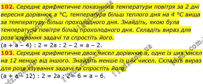 102. Середнє арифметичне показників температури повітря за 2 дні вересня дорівнює а °С, температура більш теплого дня на 4 °С вища за температуру більш прохолодного дня. Знайдіть, якою була температура повітря більш прохолодного дня. Складіть вираз для розв’язування задачі та спростіть його. (а + а – 4) : 2 = 2а : 2 – 2 = а – 2. 103. Середнє арифметичне двох чисел дорівнює а, одне із цих чисел на 12 менше від іншого. Знайдіть менше із цих чисел. Складіть вираз для розв’язування задачі та спростіть його. (а + а – 12) : 2 = 2а : 2 – 6 = а – 6.
