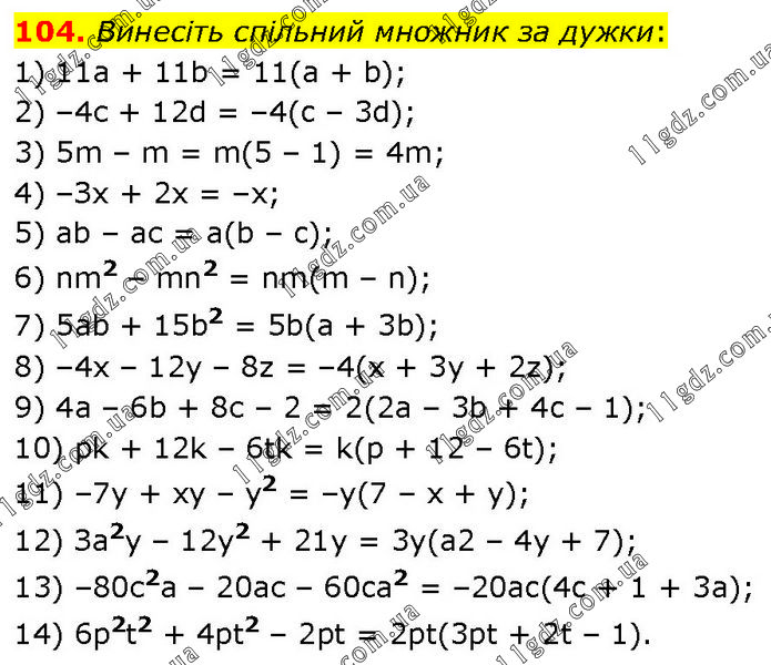 Винесіть спільний множник за дужки: 1) 11a + 11b = 11(a + b); 2) –4с + 12d = –4(c – 3d); 3) 5m – m = m(5 – 1) = 4m; 4) –Зх + 2х = –x; 5) ab – ас = a(b – c); 6) nm2 – mn2 = nm(m – n); 7) 5аb + 15b2 = 5b(a + 3b); 8) –4х – 12у – 8z = –4(x + 3y + 2z); 9) 4а – 6b + 8с – 2 = 2(2a – 3b + 4c – 1); 10) pk + 12k – 6tk = k(p + 12 – 6t); 11) –7у + ху – у2 = –y(7 – x + y); 12) За2у – 12у2 + 21у = 3y(a2 – 4y + 7); 13) –80с2а – 20ас – 60ca2 = –20ac(4c + 1 + 3a); 14) 6p2t2 + 4pt2 – 2pt = 2pt(3pt + 2t – 1).