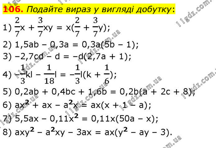 Подайте вираз у вигляді добутку: 1) 2/7х + 3/7ху = x(2/7 + 3/7у); 2) 1,5аb – 0,3а = 0,3a(5b – 1); 3) –2,7cd – d = –d(2,7a + 1); 4) –1/3kl – 1/18l = –1/3l(k + 1/6); 5) 0,2аb + 0,4bс + 1,6b = 0,2b(a + 2c + 8); 6) ах2 + ах – а2х = ax(x + 1 – a); 7) 5,5ах – 0,11x2 = 0,11x(50a – x); 8) аху2 – а2ху – 3ах = ax(y2 – ay – 3).