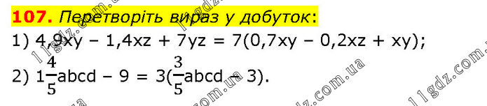Перетворіть вираз у добуток: 1) 4,9ху – 1,4xz + 7yz = 7(0,7xy – 0,2хz + ху); 2) 14/5abcd – 9 = 3(3/5abcd – 3).