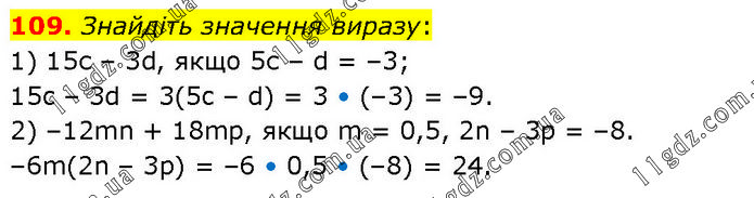 Знайдіть значення виразу: 1) 15с – 3d, якщо 5с – d = –3; 15c – 3d = 3(5c – d) = 3 • (–3) = –9. 2) –12mn + 18mp, якщо m = 0,5, 2n – 3р = –8. –6m(2n – 3p) = –6 • 0,5 • (–8) = 24.