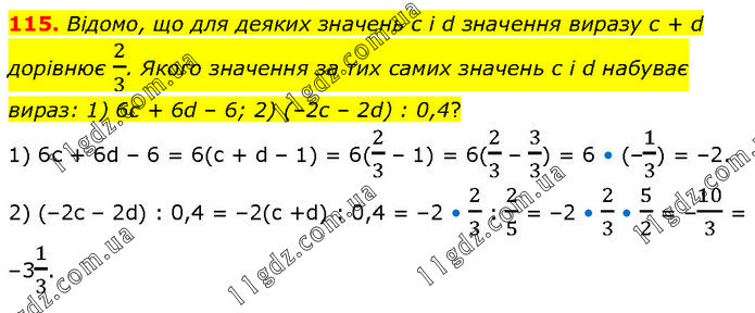 Відомо, що для деяких значень с і d значення виразу с + d дорівнює 2/3. Якого значення за тих самих значень с і d набуває вираз: 1) 6с + 6d – 6; 2) (–2с – 2d) : 0,4? 1) 6с + 6d – 6 = 6(c + d – 1) = 6(2/3 – 1) = 6(2/3 – 3/3) = 6 • (–1/3) = –2. 2) (–2с – 2d) : 0,4 = –2(c +d) : 0,4 = –2 • 2/3 : 2/5 = –2 • 2/3 • 5/2 = –10/3 = –31/3.
