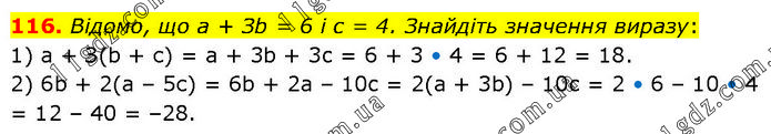 Відомо, що а + Зb = 6 і с = 4. Знайдіть значення виразу: 1) а + З(b + с) = a + 3b + 3c = 6 + 3 • 4 = 6 + 12 = 18. 2) 6b + 2(а – 5с) = 6b + 2a – 10c = 2(a + 3b) – 10c = 2 • 6 – 10 • 4 = 12 – 40 = –28.