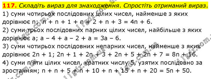 Складіть вираз для знаходження. Спростіть отриманий вираз. 1) суми чотирьох послідовних цілих чисел, найменше з яких дорівнює n; n + n + 1 + n + 2 + n + 3 = 4n + 6. 2) суми трьох послідовних парних цілих чисел, найбільше з яких дорівнює а; a – 4 + a – 2 + a = 3a – 6. 3) суми чотирьох послідовних непарних чисел, найменше з яких дорівнює 2n + 1; 2n + 1 + 2n + 3 + 2n + 5 + 2n + 7 = 8n + 16. 4) суми п’яти цілих чисел, кратних числу 5, узятих послідовно за зростанням; n + n + 5 + n + 10 + n + 15 + n + 20 = 5n + 50.