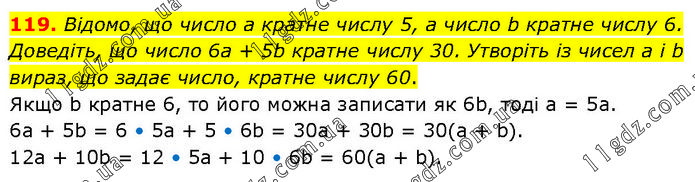 Відомо, що число а кратне числу 5, а число b кратне числу 6. Доведіть, що число 6а + 5b кратне числу 30. Утворіть із чисел а і b вираз, що задає число, кратне числу 60. Якщо b кратне 6, то його можна записати як 6b, тоді а = 5а. 6a + 5b = 6 • 5a + 5 • 6b = 30a + 30b = 30(a + b). 12a + 10b = 12 • 5a + 10 • 6b = 60(a + b).
