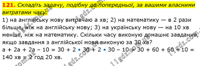 Складіть задачу, подібну до попередньої, за вашими власними витратами часу. 1) на англійську мову витрачаю а хв; 2) на математику — в 2 рази більше, ніж на англійську мову; 3) на українську мову — на 10 хв менше, ніж на математику. Скільки часу виконую домашнє завдання, якщо завдання з англійської мови виконую за 30 хв? а + 2а + 2а – 10 = 30 + 2 • 30 + 2 • 30 – 10 = 30 + 60 + 60 – 10 = 140 хв = 2 год 20 хв.