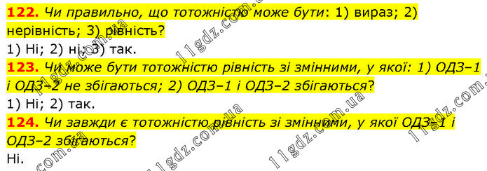122. Чи правильно, що тотожністю може бути: 1) вираз; 2) нерівність; 3) рівність? 1) Ні; 2) ні; 3) так. 123. Чи може бути тотожністю рівність зі змінними, у якої: 1) ОДЗ–1 і ОДЗ–2 не збігаються; 2) ОДЗ–1 і ОДЗ–2 збігаються? 1) Ні; 2) так. 124. Чи завжди є тотожністю рівність зі змінними, у якої ОДЗ–1 і ОДЗ–2 збігаються? Ні.