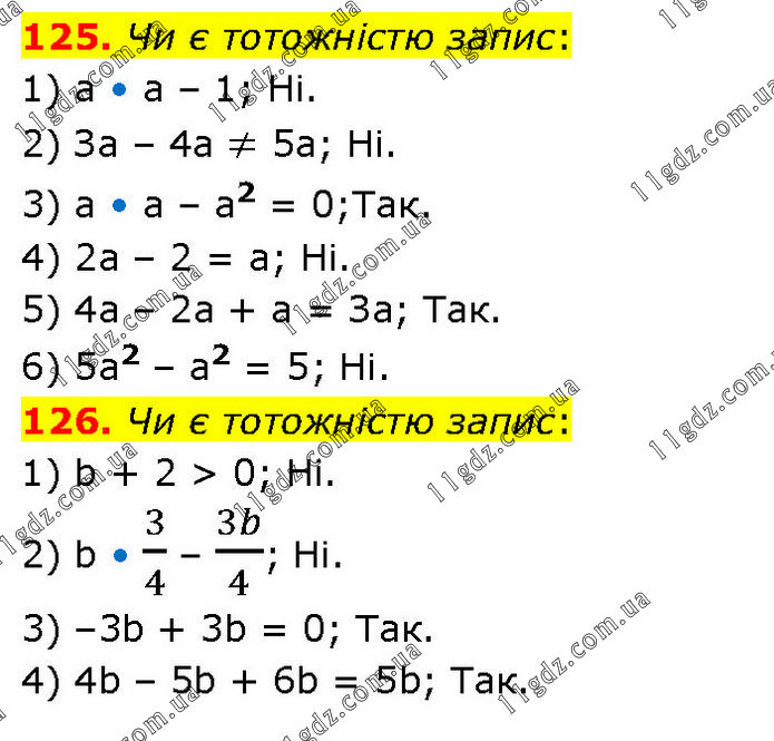 125. Чи є тотожністю запис: 1) а • а – 1; Ні. 2) За – 4а ≠ 5а; Ні. 3) а • а – а2 = 0; Так. 4) 2а – 2 = а; Ні. 5) 4а – 2а + а = За; Так. 6) 5а2 – а2 = 5; Ні. 126. Чи є тотожністю запис: 1) b + 2 > 0; Ні. 2) b • 3/4 – 3b/4; Ні. 3) –3b + 3b = 0; Так. 4) 4b – 5b + 6b = 5b; Так.