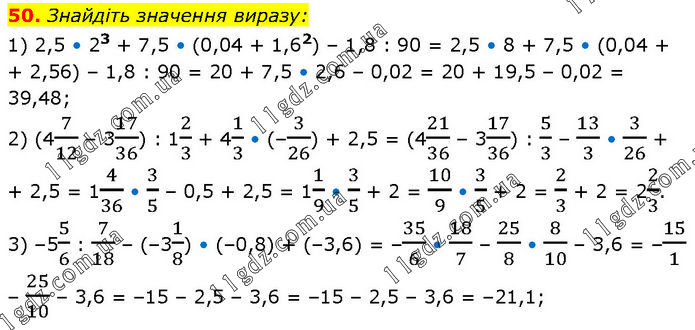Знайдіть значення виразу: 1) 2,5 • 23 + 7,5 • (0,04 + 1,62) – 1,8 : 90 = 2,5 • 8 + 7,5 • (0,04 + + 2,56) – 1,8 : 90 = 20 + 7,5 • 2,6 – 0,02 = 20 + 19,5 – 0,02 = 39,48; 2) (47/12 – 317/36) : 12/3 + 41/3 • (–3/26) + 2,5 = (421/36 – 317/36) : 5/3 – 13/3 • 3/26 + + 2,5 = 14/36 • 3/5 – 0,5 + 2,5 = 11/9 • 3/5 + 2 = 10/9 • 3/5 + 2 = 2/3 + 2 = 22/3. 3) –55/6 : 7/18 – (–31/8) • (–0,8) + (–3,6) = –35/6 • 18/7 – 25/8 • 8/10 – 3,6 = –15/1 – 25/10 – 3,6 = –15 – 2,5 – 3,6 = –15 – 2,5 – 3,6 = –21,1;