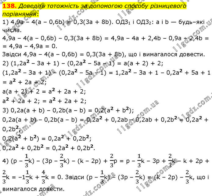 Доведіть тотожність за допомогою способу різницевого порівняння: 1) 4,9а – 4(а – 0,6b) = 0,3(3а + 8b). ОДЗ1 і ОД32: а і b — будь–які числа. 4,9a – 4(а – 0,6b) – 0,3(3а + 8b) = 4,9а – 4а + 2,4b – 0,9а – 2,4b = = 4,9а – 4,9а = 0. Звідси 4,9а – 4(а – 0,6b) = 0,3(3а + 8b), що і вимагалося довести. 2) (1,2а2 – За + 1) – (0,2а2 – 5а – 1) = а(а + 2) + 2; (1,2а2 – За + 1) – (0,2а2 – 5а – 1) = 1,2а2 – За + 1 – 0,2а2 + 5а + 1 = а2 + 2a + 2; а(а + 2) + 2 = а2 + 2a + 2; а2 + 2a + 2; = а2 + 2a + 2; 3) 0,2а(а + b) – 0,2b(а – b) = 0,2(а2 + b2); 0,2а(а + b) – 0,2b(а – b) = 0,2а2 + 0,2ab – 0,2ab + 0,2b2 = 0,2а2 + 0,2b2; 0,2(а2 + b2) = 0,2а2 + 0,2b2; 0,2а2 + 0,2b2 = 0,2а2 + 0,2b2. 4) (p – 1/3k) – (3p – 2/3k) – (k – 2p) + 2/3p = p – 1/3k – 3p + 2/3k – k + 2p + 2/3k = –11/3k + 4/3k = 0. Звідси (p – 1/3k) – (3p – 2/3k) = (k – 2p) – 2/3k, що і вимагалося довести.