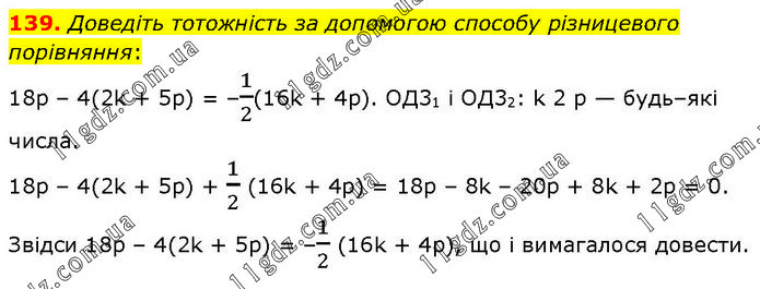 Доведіть тотожність за допомогою способу різницевого порівняння: 18р – 4(2k + 5р) = –1/2(16k + 4р). ОД31 і ОД32: k 2 р — будь–які числа. 18р – 4(2k + 5р) + 1/2 (16k + 4р) = 18р – 8k – 20р + 8k + 2р = 0. Звідси 18р – 4(2k + 5р) = –1/2 (16k + 4р), що і вимагалося довести.
