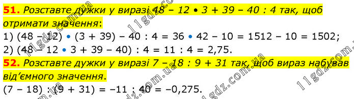 51. Розставте дужки у виразі 48 – 12 • 3 + 39 – 40 : 4 так, щоб отримати значення: 1) (48 – 12) • (3 + 39) – 40 : 4 = 36 • 42 – 10 = 1512 – 10 = 1502; 2) (48 – 12 • 3 + 39 – 40) : 4 = 11 : 4 = 2,75. 52. Розставте дужки у виразі 7 – 18 : 9 + 31 так, щоб вираз набував від’ємного значення. (7 – 18) : (9 + 31) = –11 : 40 = –0,275.