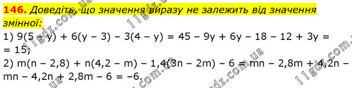 Доведіть, що значення виразу не залежить від значення змінної: 1) 9(5 – y) + 6(у – 3) – 3(4 – у) = 45 – 9y + 6y – 18 – 12 + 3y = = 15; 2) m(n – 2,8) + n(4,2 – m) – 1,4(3n – 2m) – 6 = mn – 2,8m + 4,2n – mn – 4,2n + 2,8m – 6 = –6.
