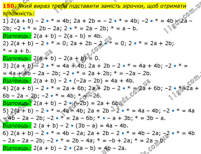 Який вираз треба підставити замість зірочки, щоб отримати тотожність: 1) 2(a + b) – 2 • * = 4b; 2a + 2b = – 2 • * = 4b; –2 • * = 4b – 2a – 2b; –2 • * = 2b – 2a; 2 • * = 2a – 2b; * = a – b. Відповідь: 2(a + b) – 2(a – b) = 4b. 2) 2(a + b) – 2 • * = 0; 2a + 2b – 2 • * = 0; 2 • * = 2a + 2b; * = a + b. Відповідь: 2(a + b) – 2(a + b) = 0. 3) 2(a + b) – 2 • * = 4a + 4b; 2a + 2b – 2 • * = 4a + 4b; –2 • * = = 4a + 4b – 2a – 2b; –2 • * = 2a + 2b; * = –2a – 2b. Відповідь: 2(a + b) – 2 • (–2a – 2b) = 4a + 4b. 4) 2(a + b) – 2 • * = 2a + 6b; 2a + 2b – 2 • * = 2a + 6b; –2 • *=2a + 6b – 2a – 2b; –2 • * = 4b; * = –26. Відповідь: 2(a + b) – 2 • (–2b) = 2a + 6b. 5) 2(a + b) – 2 • * = 4a – 4b; 2a + 2b – 2 • * = 4a – 4b; –2 • * = 4a – 4b – 2a – 2b; –2 • * = 2a – 6b; * • – a + 3b; * = 3b – a. Відповідь: 2 (a + b) – 2 • (3b – a) = 4a – 4b. 6) 2(a + b) – 2 • * = 4b – 2a; 2a + 2b – 2 • * = 4b – 2a; –2 • * = 4b – 2a – 2a – 2b; –2 • * = 2b – 4a; * = –b + 2a; * = 2a – b. Відповідь: 2(a + b) – 2 • (2a – b) = 4b – 2a.