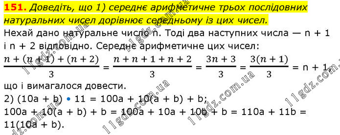 Доведіть, що 1) середнє арифметичне трьох послідовних натуральних чисел дорівнює середньому із цих чисел. Нехай дано натуральне число n. Тоді два наступних числа — n + 1 і n + 2 відповідно. Середнє арифметичне цих чисел: (n + (n + 1) + (n + 2))/3 = (n + n + 1 + n + 2)/3 = (3n + 3)/3 = (3(n + 1))/3 = n + 1, що і вимагалося довести. 2) (10a + b) • 11 = 100a + 10(a + b) + b; 100a + 10(a + b) + b = 100a + 10a + 10b + b = 110a + 11b = 11(10a + b).