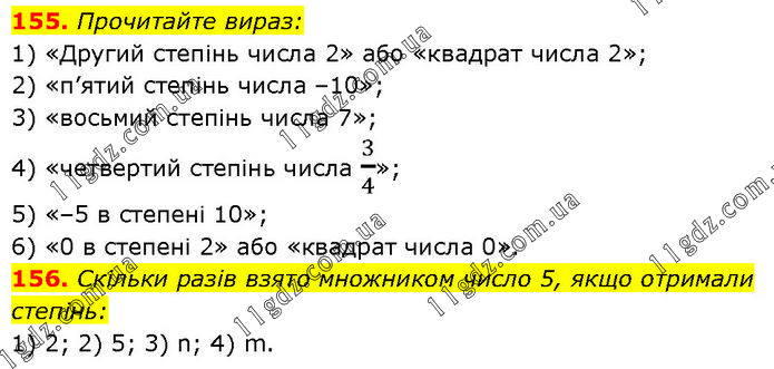 155. Прочитайте вираз: 1) «Другий степінь числа 2» або «квадрат числа 2»; 2) «п’ятий степінь числа –10»; 3) «восьмий степінь числа 7»; 4) «четвертий степінь числа 3/4»; 5) «–5 в степені 10»; 6) «0 в степені 2» або «квадрат числа 0». 156. Скільки разів взято множником число 5, якщо отримали степінь: 1) 2; 2) 5; 3) n; 4) m.