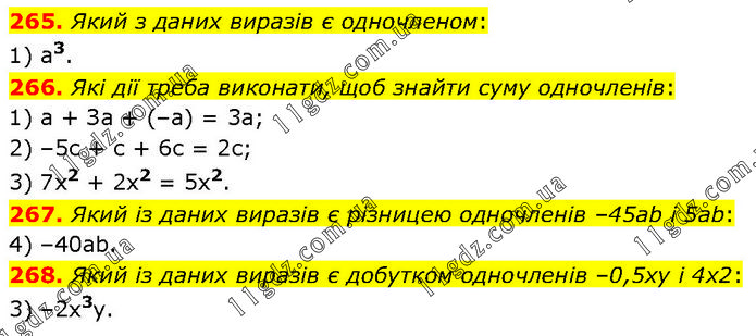 265. Який з даних виразів є одночленом: 1) а3. 266. Які дії треба виконати, щоб знайти суму одночленів: 1) a + За + (–а) = 3а; 2) –5с + с + 6с = 2с; 3) 7х2 + 2х2 = 5х2. 267. Який із даних виразів є різницею одночленів –45аb і 5ab: 4) –40аb. 268. Який із даних виразів є добутком одночленів –0,5ху і 4x2: 3) –2х3у.