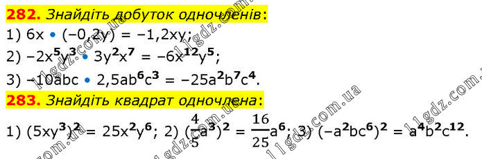 282. Знайдіть добуток одночленів: 1) 6х • (–0,2у) = –1,2xy; 2) –2х5у3 • Зу2х7 = –6х12у5; 3) –10abc • 2,5ab6c3 = –25a2b7c4. 283. Знайдіть квадрат одночлена: 1) (5xy3)2 = 25x2y6; 2) (4/5а3)2 = 16/25а6; 3) (–а2bс6)2 = а4b2с12.