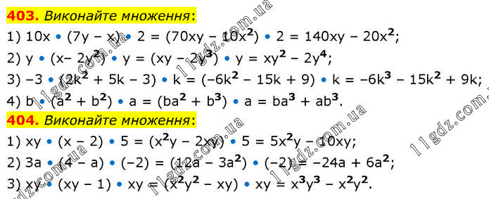 403. Виконайте множення: 1) 10x • (7у – х) • 2 = (70xy – 10x2) • 2 = 140xy – 20x2; 2) у • (х– 2у2) • у = (xy – 2y3) • y = xy2 – 2y4; 3) –3 • (2k2 + 5k – 3) • k = (–6k2 – 15k + 9) • k = –6k3 – 15k2 + 9k; 4) b • (а2 + b2) • а = (ba2 + b3) • a = ba3 + ab3. 404. Виконайте множення: 1) ху • (х – 2) • 5 = (x2y – 2xy) • 5 = 5x2y – 10xy; 2) За • (4 – а) • (–2) = (12a – 3a2) • (–2) = –24a + 6a2; 3) ху • (ху – 1) • ху = (x2y2 – xy) • xy = x3y3 – x2y2.