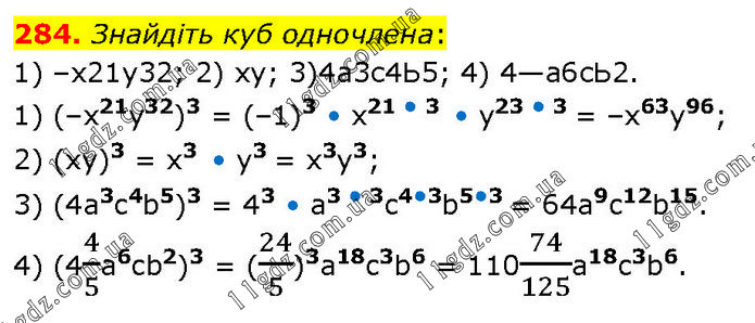 Знайдіть куб одночлена: 1) –х21у32; 2) ху; 3)4а3с4Ь5; 4) 4—а6сЬ2. 1) (–x21y32)3 = (–1)3 • x21 • 3 • y23 • 3 = –x63y96; 2) (xy)3 = x3 • y3 = x3y3; 3) (4a3c4b5)3 = 43 • a3 • 3c4•3b5•3 = 64a9c12b15. 4) (44/5a6cb2)3 = (24/5)3a18c3b6 = 11074/125a18c3b6.