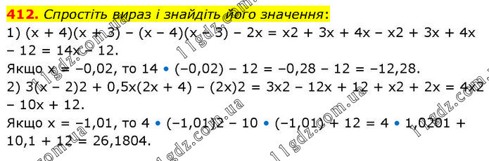 Спростіть вираз і знайдіть його значення: 1) (х + 4)(х + 3) – (х – 4)(х – 3) – 2х = х2 + 3х + 4х – х2 + 3х + 4х – 12 = 14х – 12. Якщо х = –0,02, то 14 • (–0,02) – 12 = –0,28 – 12 = –12,28. 2) 3(х – 2)2 + 0,5х(2х + 4) – (2х)2 = 3х2 – 12х + 12 + х2 + 2х = 4х2 – 10х + 12. Якщо х = –1,01, то 4 • (–1,01)2 – 10 • (–1,01) + 12 = 4 • 1,0201 + 10,1 + 12 = 26,1804.