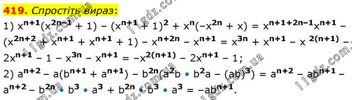 Спростіть вираз: 1) xn+1(x2n–1 + 1) – (хn+1 + 1)2 + хn(–х2n + х) = xn+1+2n–1xn+1 – (х2n+2 + хn+1 + хn+1 + 1) – хn+2n – хn+1 = x3n + xn+1 – х 2(n+1) – 2хn+1 – 1 – x3n – xn+1 = –х2(n+1) – 2хn+1 – 1; 2) аn+2 – а(bn+1 + аn+1) – b2n(а2b • b2а – (аb)3) = аn+2 – abn+1 – an+2 – b2n • b3 • a3 + b2n • b3 • a3 = –аbn+1.