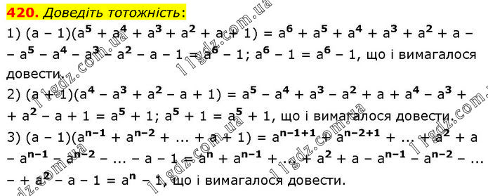 Доведіть тотожність: 1) (а – 1)(а5 + а4 + а3 + а2 + а + 1) = а6 + а5 + а4 + а3 + а2 + а – – а5 – а4 – а3 – а2 – а – 1 = а6 – 1; а6 – 1 = а6 – 1, що і вимагалося довести. 2) (а + 1)(а4 – а3 + а2 – а + 1) = а5 – а4 + а3 – а2 + а + а4 – а3 + + а2 – а + 1 = а5 + 1; а5 + 1 = а5 + 1, що і вимагалося довести. 3) (а – 1)(аn–1 + аn–2 + ... + а + 1) = аn–1+1 + аn–2+1 + ... + а2 + a – аn–1 – аn–2 – ... – а – 1 = аn + аn–1 + ... + а2 + a – аn–1 – аn–2 – ... – + а2 – а – 1 = аn – 1, що і вимагалося довести.