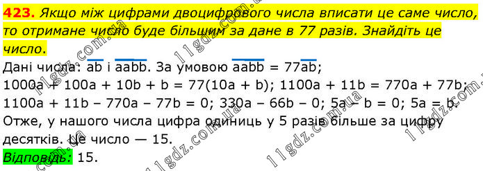 Якщо між цифрами двоцифрового числа вписати це саме число, то отримане число буде більшим за дане в 77 разів. Знайдіть це число. Дані числа: ab і aabb. За умовою aabb = 77аb; 1000a + 100а + 10b + b = 77(10а + b); 1100а + 11b = 770а + 77b; 1100а + 11b – 770а – 77b = 0; 330а – 66b – 0; 5а – b = 0; 5а = b. Отже, у нашого числа цифра одиниць у 5 разів більше за цифру десятків. Це число — 15. Відповідь: 15.